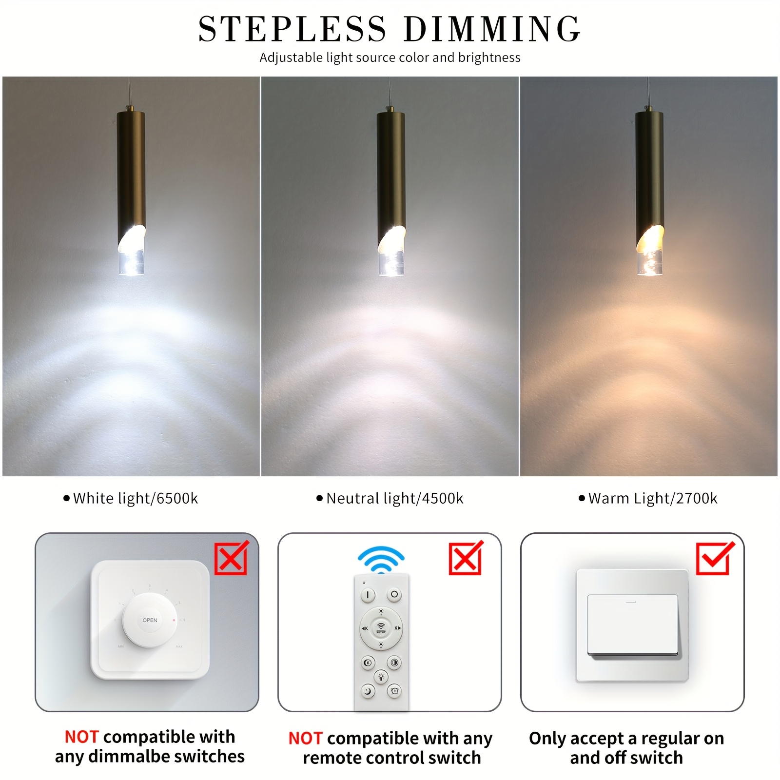 [Mini Linear Pendant Light] This 8W, 800-lumen modern LED pendant light fixture offers 3 selectable color temperatures: 3000K warm white, 4500K neutral white, and 6500K cool white. It features an integrated energy-efficient LED bulb with a 20,000-hour lifespan, operating at AC 85-265V, 50-60HZ. Smart short circuit and current protection ensure safety. Ideal for kitchens, dining rooms, and more. Note: Dimming not supported.
