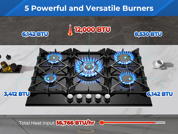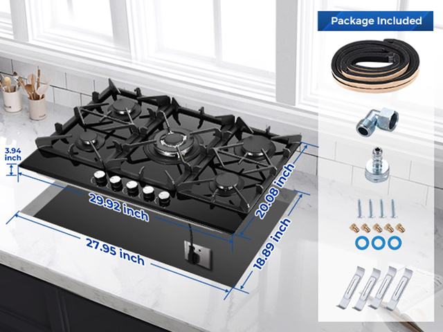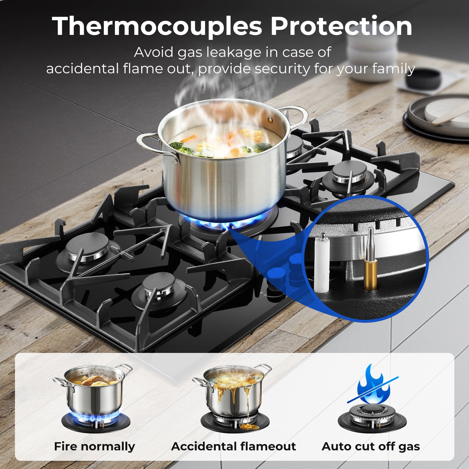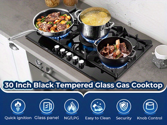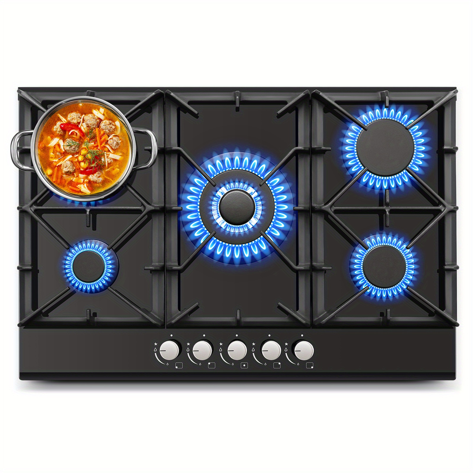 30 Inch 5-Burner Gas Cooktop with Thermocouple Protection & Black Glass Top - LPG/NG Dual Fuel Propane/Natural Gas Stove, Heavy-Duty Construction with Precise Flame Control & Safety Shutoff for Indoor, RV, Apartment, Home Kit