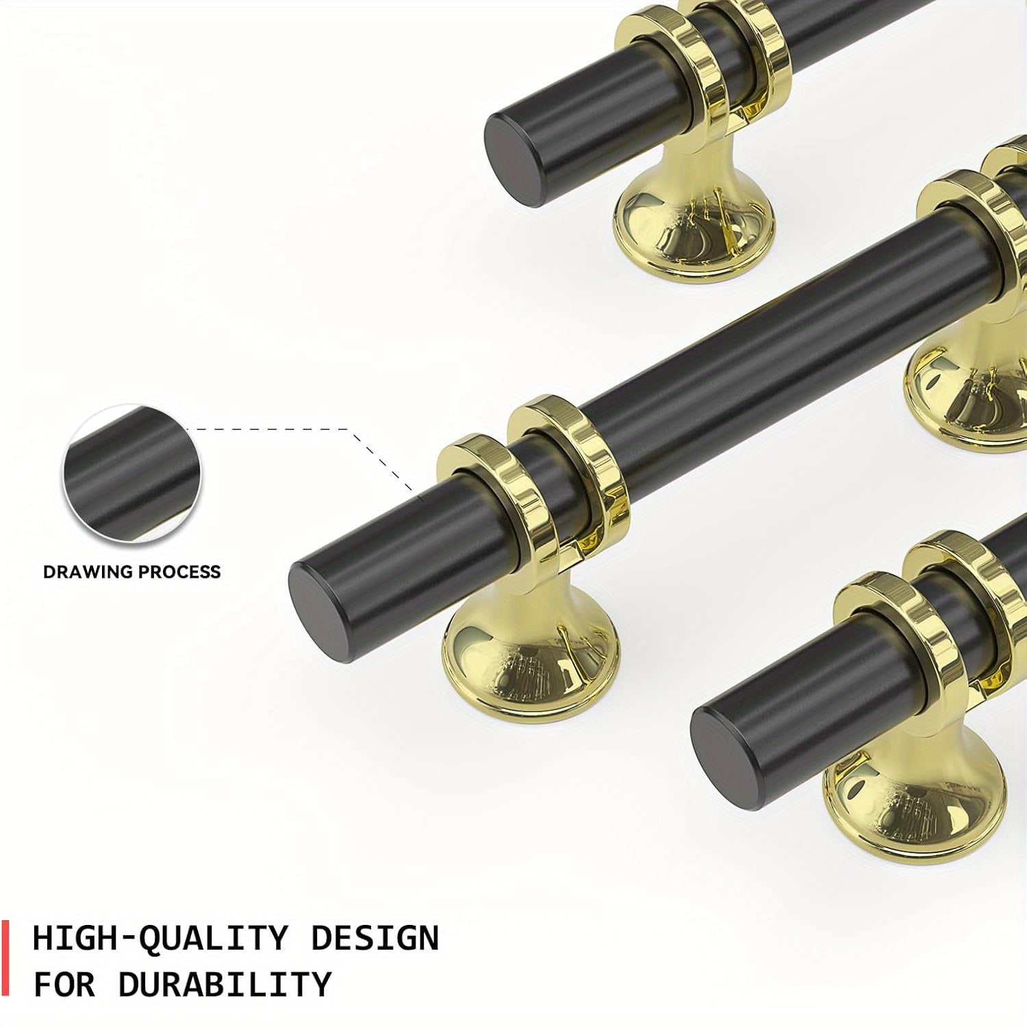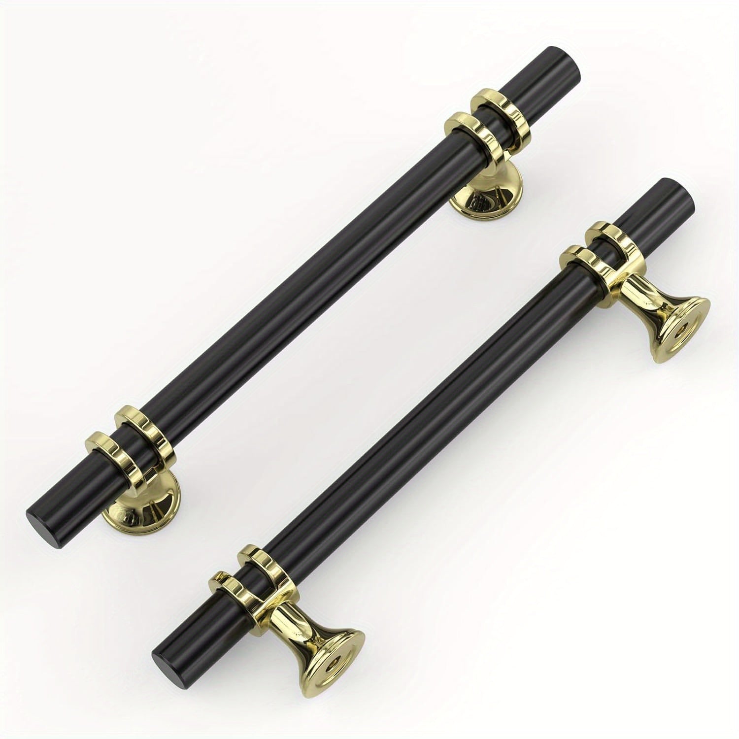 Cabinet hardware made of metal in black and gold, featuring modern T-shaped knobs with a glossy finish. Available in various sizes, including 3-inch and 5-inch pulls, suitable for kitchen and dresser drawers.